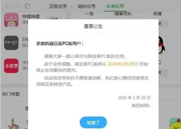 就在前不久的2月20日,豌豆荚方面发布公告称,由于业务调整,豌豆荚PC版将从2020年2月28日开始停止在线服务的提供。