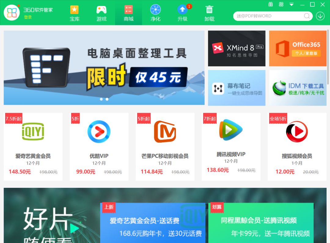 在新版360软件管家,还增加了360软件商城,商城上架有国内外热门的付费软件以及会员活动,随时享受各种折扣!