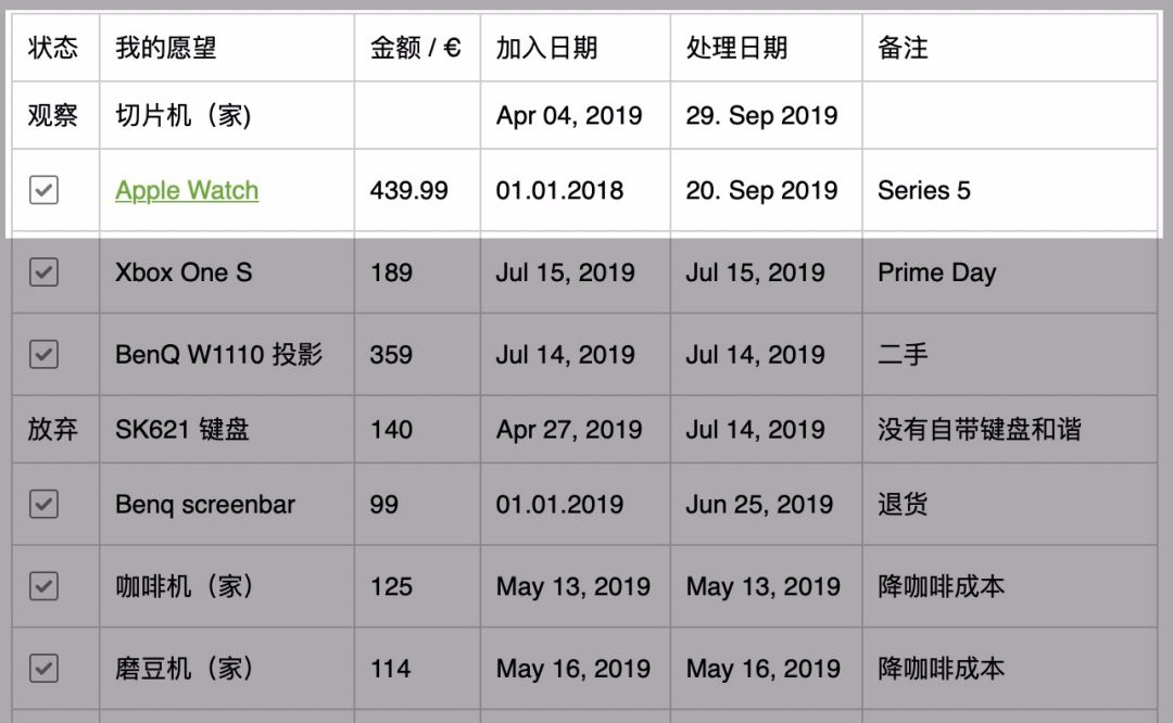 这个应该不应太介绍了,大家在公众号里面问得最多的「愿望清单」其实就是印象笔记的表格功能,并不是专门的软件。之所以选择了印象笔记还是因为对于各种第三方支持的比较好,比如网页剪藏、新闻存档、微信存档等等。