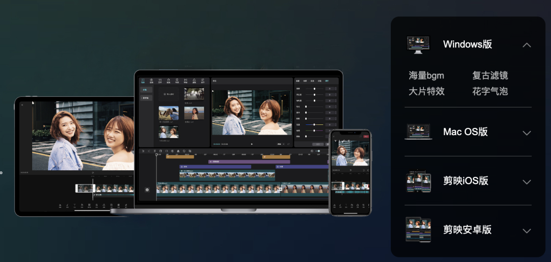 字节跳动出品的视频剪辑软件,支持 PC 端和移动端的主流系统。虽然 PC 端的剪映功能远远不及 PR 要强大,但是内置丰富素材、自动配字幕这两个点就足够吸引创作者去使用它了。