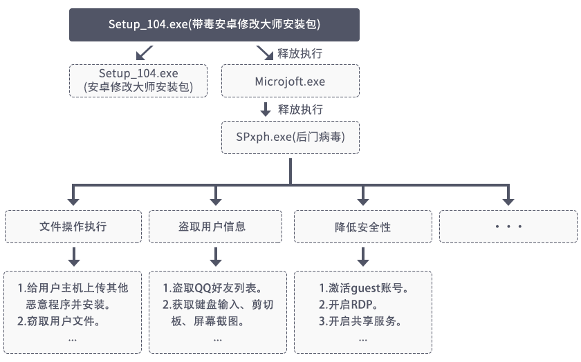 近期,火绒发现一款名叫“安卓修改大师”的安卓应用破解软件携带后门病毒。经火绒工程师分析,该病毒软件运行后会释放病毒模块,根据服务器下发的指令可以执行下载上传任意文件、获取用户键盘记录、获取剪切板记录、获取屏幕截图,获取QQ好友列表等行为。