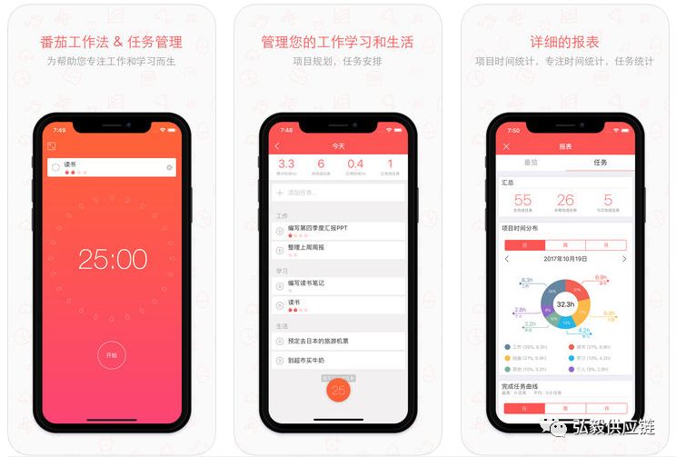 在APP商店里有多款番茄工作法的应用可以下载,由于工作原理简单,这些APP功能都很相似。