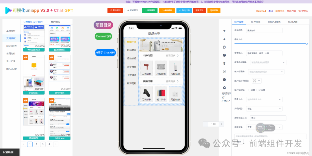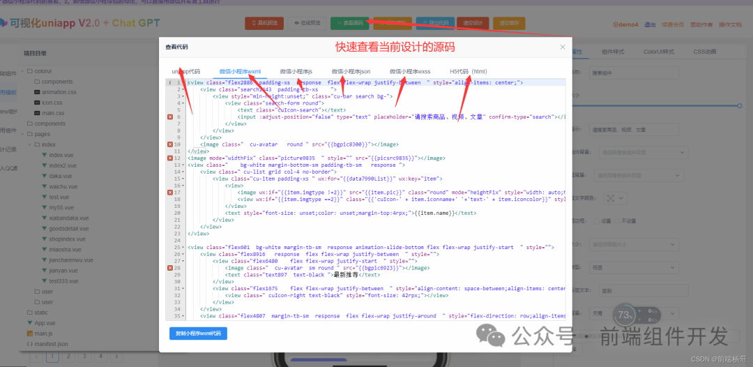 一键生成代码:在界面设计完成后,工具可以自动生成对应的uniapp、H5和小程序代码。这不仅减少了开发者的编码工作量,还能确保生成的代码质量和一致性。