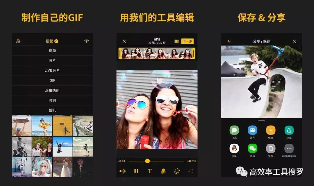 同时还可以保存多种质量的视频/GIF,可以一键分享到微信和朋友圈。