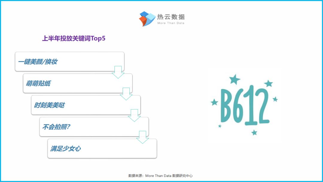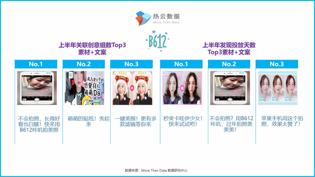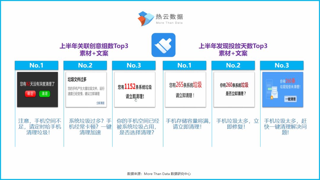 以下为上述360清理大师,百度,嗨来电以及B612咔叽,4款App上半年投放素材的Top5投放文案关键词以及Hot投放素材/文案。