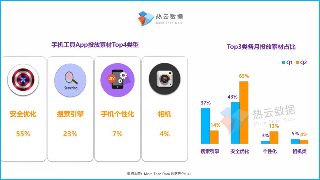 ●整体上,安全优化类在今年上半年的投放素材占比上涨态势十分显著。Q2来看,手机个性化类的App投放量占比提升了一成,而当中主要以“来电视频”功能类的App为主;