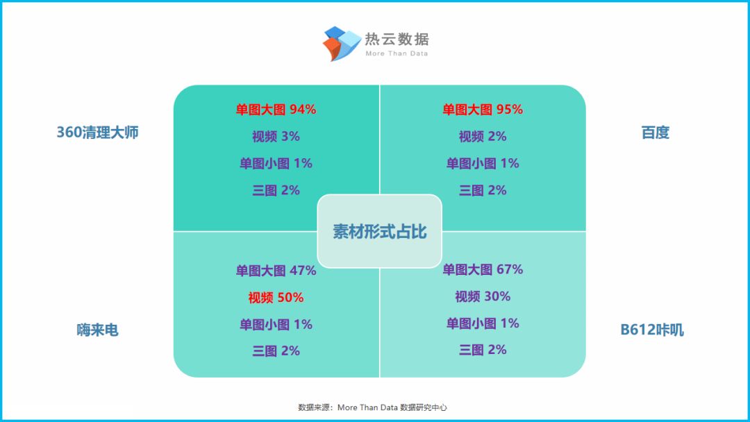 按4款App在上半年各自投放的素材形式占比来看,下图“上半部”的两款App投放单图大图素材的比例远超过其它素材类型;“下半部”的嗨来电与B612咔叽两款App,凭借其App自身的定位及视频功能,该两款App投放视频素材的占比有了明显提高,但相比之下B612咔叽投放的单图大图素材占比仍为主流。