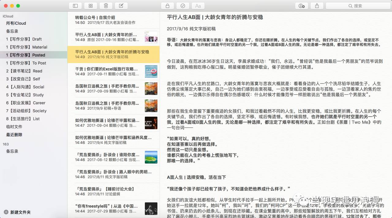 例如我目前记录的分类有:写作分享、读书笔记、自我提升、专业笔记、职业发展等。其中,写作分享又分了四个文件夹:素材 Material、草稿 Draft、初稿 To Post、成稿 Posted。大家下面看到的截图就是我已经在公众号里分享过的文章列表。