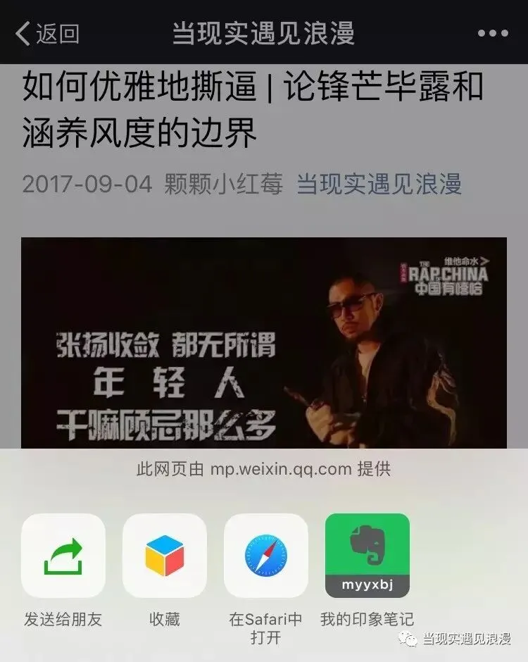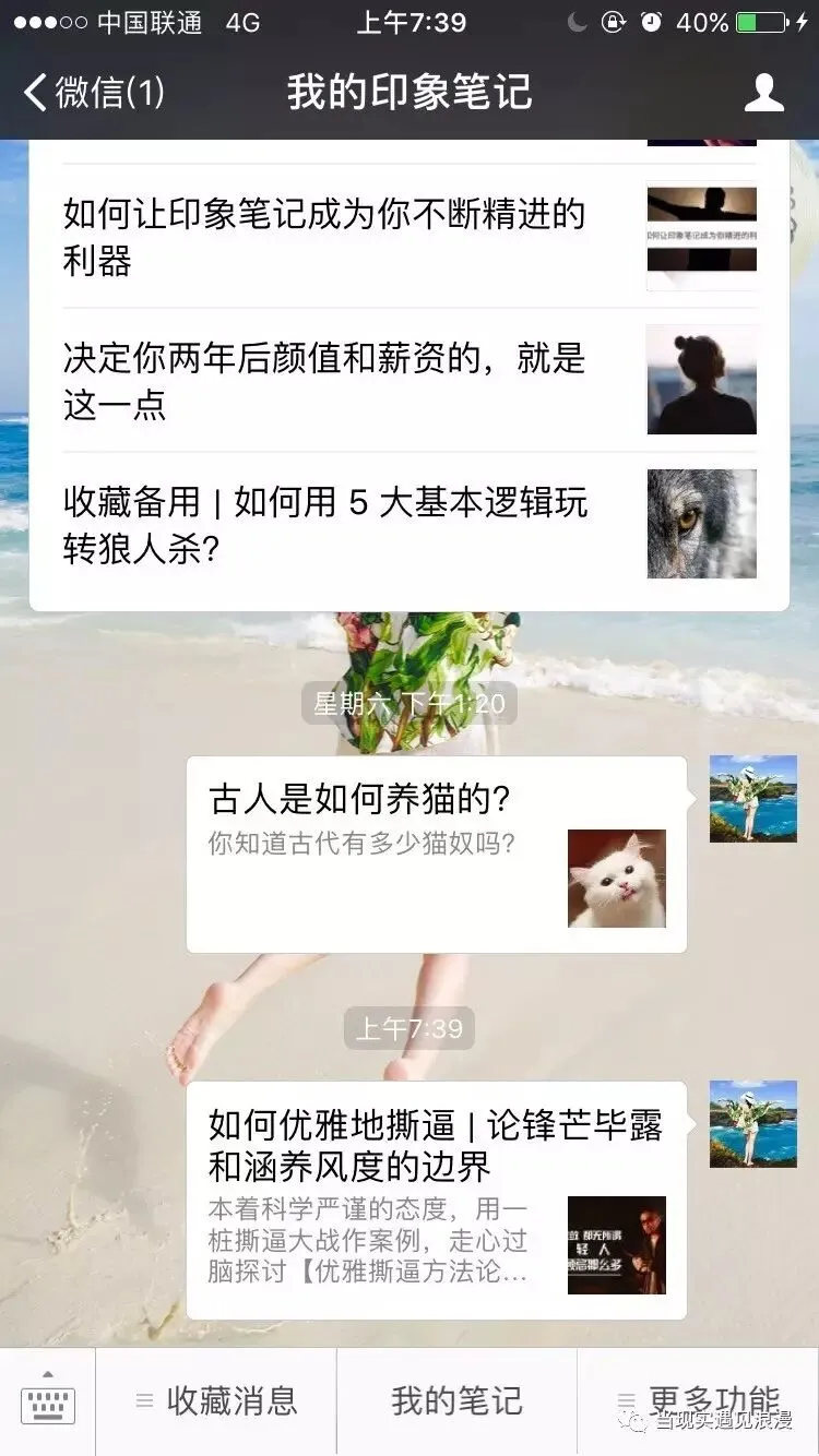 可将在网页、微信、微博上看到的照片或好文一键保存,告别复制粘贴,高效收集资料。这是我最喜欢的几乎每天都用的功能。用微信举例,绑定账号后,点击公众号文章右上角的…,点击【我的印象笔记】,保存成功。