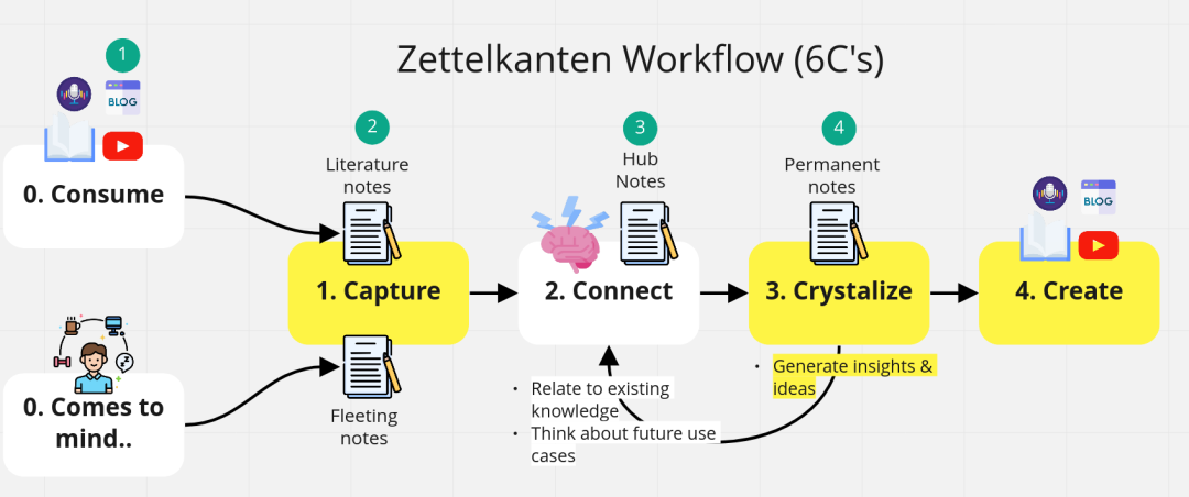 fleeting note-concrete idea-article 的核心 workflow 是:遇见信息、大卸八块、找到思路、重新组合、内化拓展。