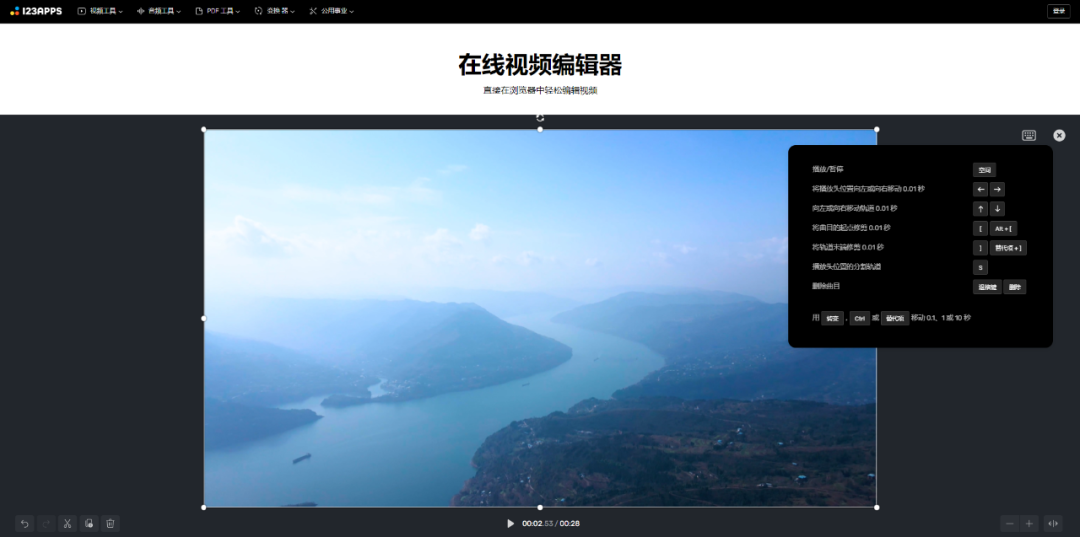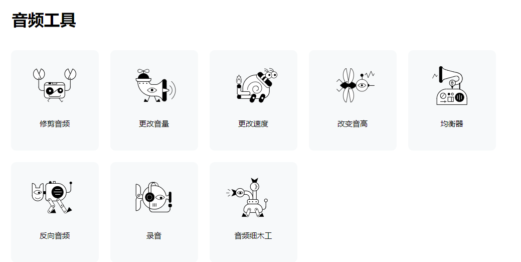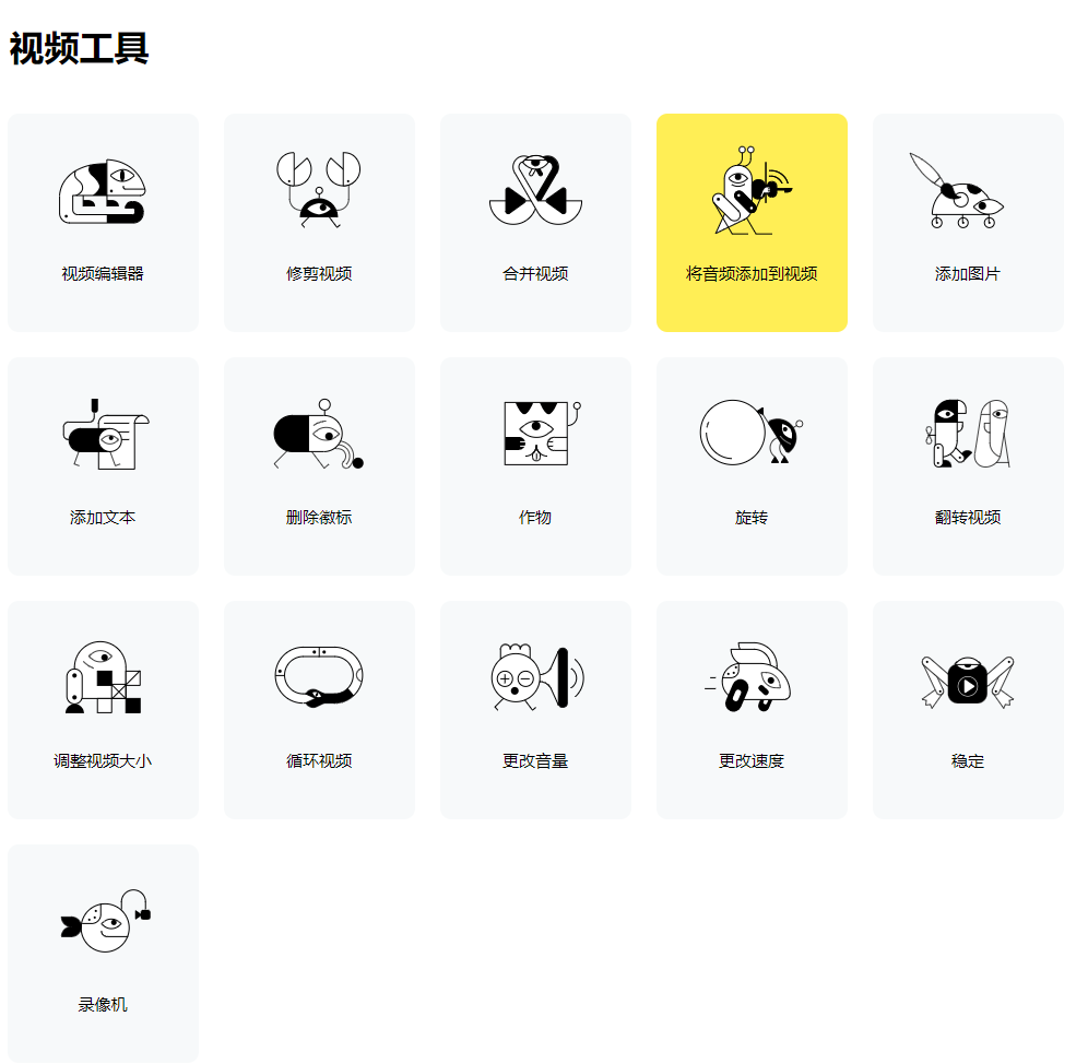 相当于一个简化版的视频剪辑工具,以网页形式呈现。在这里,你可以进行剪辑、合并视频、添加文本、调整速度等16项操作。音频工具