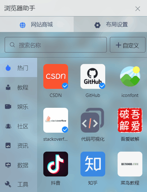 热门、教程、娱乐、社区、资讯、数据、工具、求职、系统、扩展、书签。