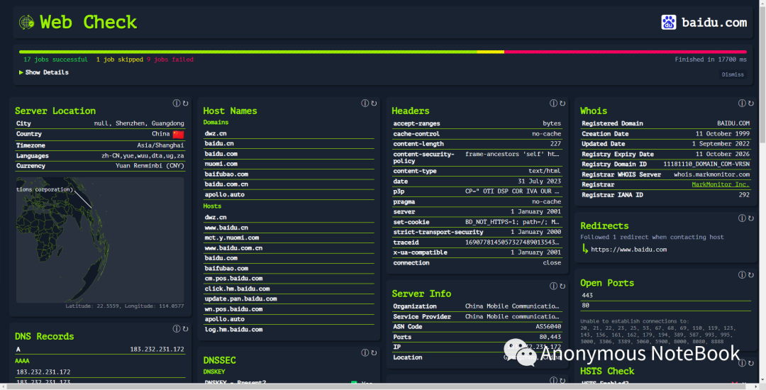 目前仪表板将显示:IP 信息、SSL 链、DNS 记录、cookie、请求头、域信息、搜索爬虫规则、页面地图、服务器位置、开放端口、跟踪路由、DNS 安全扩展、站点性能、跟踪器、关联主机名等。