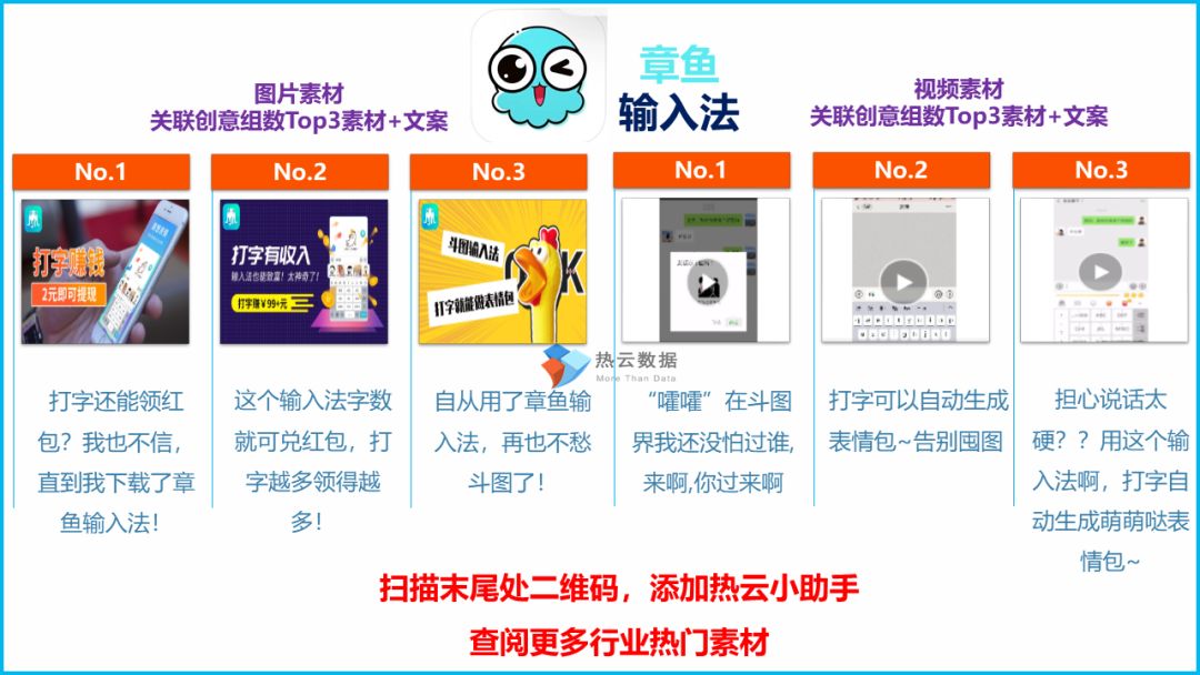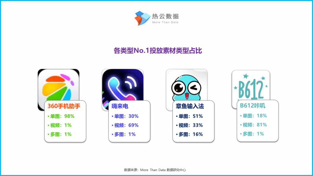 根据4种类型的Top1所投放素材的类型进行横向比对后发现:360手机助手主要以单图素材为主;B612咔叽与嗨来电视频素材较多;章鱼输入法各类型素材占比较为平均。