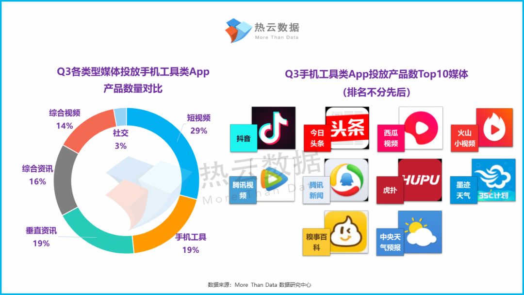手机工具App所在媒体类型的维度上,短视频媒体成为投放手机工具类App数量最多的媒体类型。此外,鉴于手机工具凭借目标用户范围广以及2级分类的产品边界相对明确,有两成手机工具类App会选择相同(1级分类)类型的媒体进行投放。右图为Q3手机工具类App投放产品数Top10媒体。
