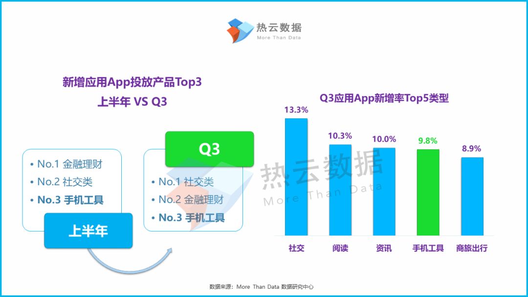 新增投放应用App的行业分布来看,手机工具类一直位列应用App全行业的前3且Q3的总体新增率为9.8%,并与阅读、资讯类App基本持平。