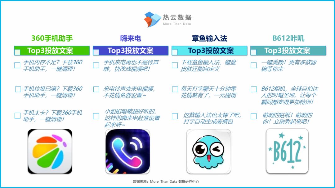 以下是4款App在Q3关联创意组数量Top3投放文案。