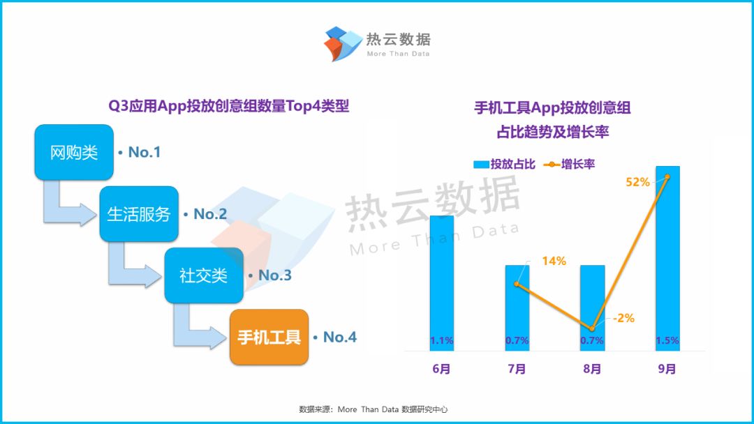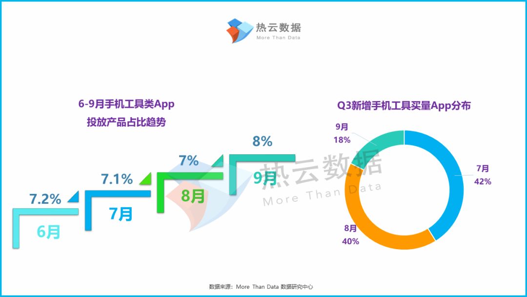 按Q3应用类App投放创意组数量维度来看,Q3手机工具类App共投放近20w创意组。这一表现也使得手机工具类App在total应用App中排名第4,比上半年上升了3位。具体各月来看,手机工具类App投放创意组数量的趋势与上述投放产品数量大致相同:9月份的开学季迎来手机工具类App买量的高发期,且增长率达到52%。