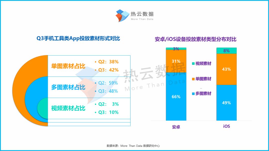 与上半年情况相同,图片素材形式(单图+多图)仍为手机工具类App最主要的投放形式。视频素材在Q3的提升非常明显,目前已占手机工具类App投放素材数量的10%。相反,多图素材的占比却明显下降。此外,安卓设备主要以多图素材形式为主,而单图素材在iOS设备的占比有了明显提升。