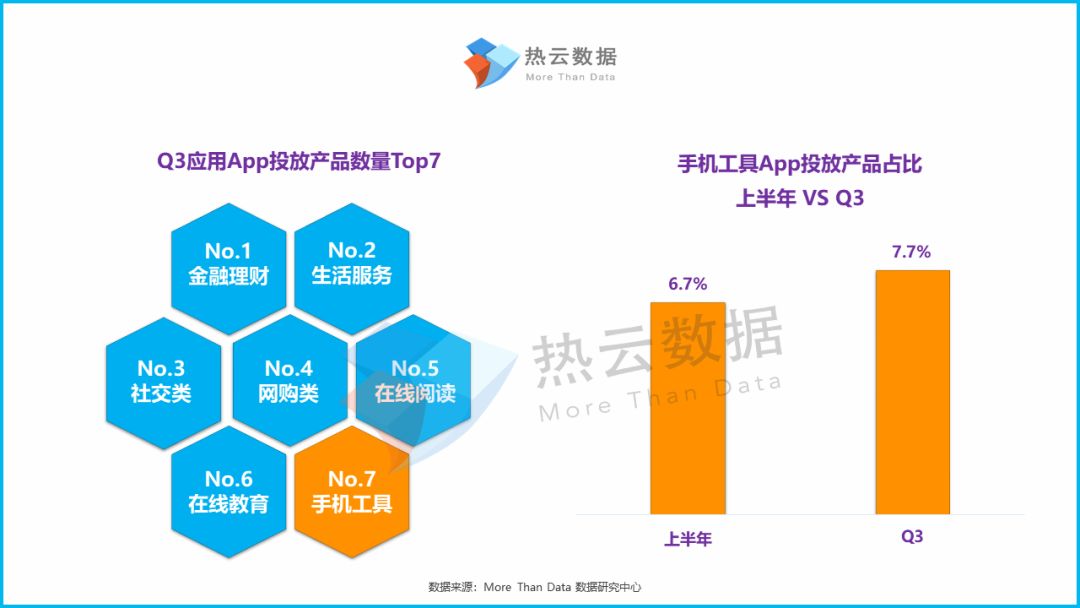根据热云数据Adinsight产品监测,手机工具类App共有百余款在Q3进行投放,占总体应用App的7.7%。与上半年相比,Q3的手机工具类App数量基本持平且总体投放名次保持不变。可见,在大量社交、阅读类App在暑期涌入“买量市场”之际,手机工具类App的买量表现相对“冷静”。
