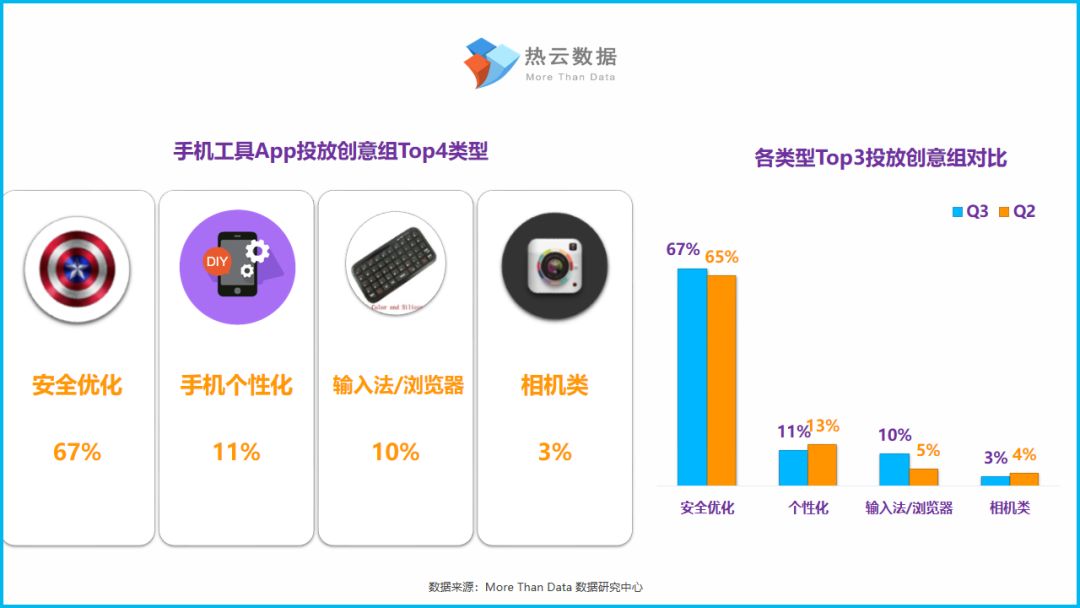整体上,随着用户对于手机安全敏感度增强以及国家层面的相关政策出台,安全优化类App继续延续着今年以来投放创意组数量“老大”的地位。与Q2情况相比,手机个性化类App投放量占比稳中有升,排在第二,而当中主要以“来电视频功能”App为主。输入法/浏览器在Q3投放创意组数量的提升十分明显,占到总体手机工具投放创意组数量的1成比例。