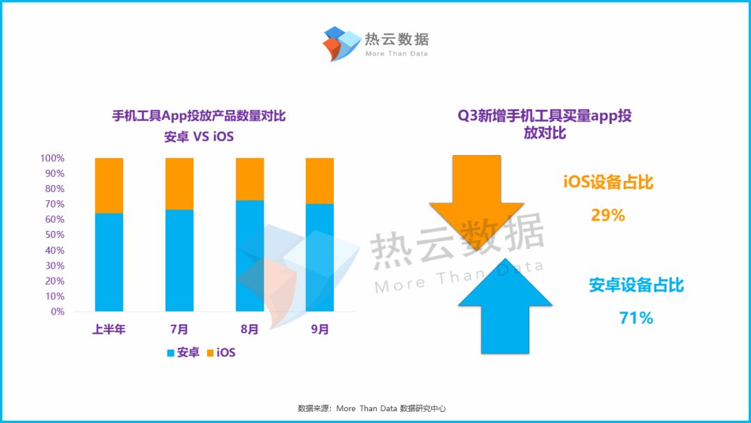 按iOS与安卓设备上分别投放手机工具App的数量对比来看,安卓设备一直是手机工具类App投放的“主阵地”。与上半年相比,Q3安卓设备投放App数量的占比进一步提升。不仅如此,Q3新增买量的手机工具App中的7成均会选择在安卓设备中进行投放。当然,这一情况同样与苹果AppStore的上架审核机制有关。