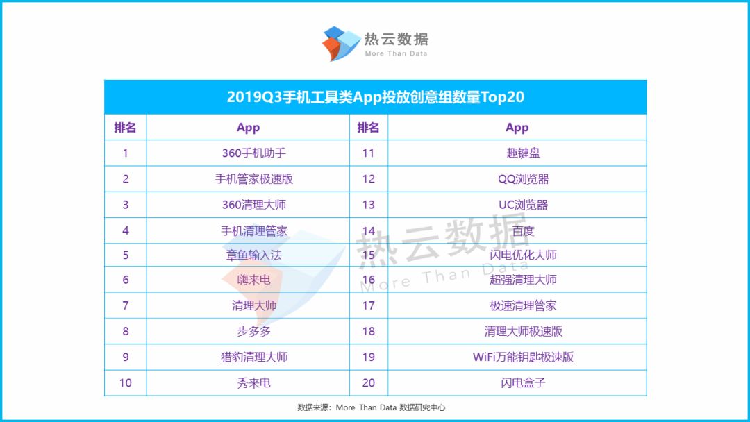 以下是Q3手机工具类App投放创意组数量Top20。360手机助手成为Q3手机工具投放量的NO.1。Top20中安全优化类App的占比达到一半,其次是输入法/浏览器类App。(扫描报告结尾热云小助手二维码并添加好友,获取完整版报告,即可了解“Q3手机工具类App投放创意组数量Top30”)