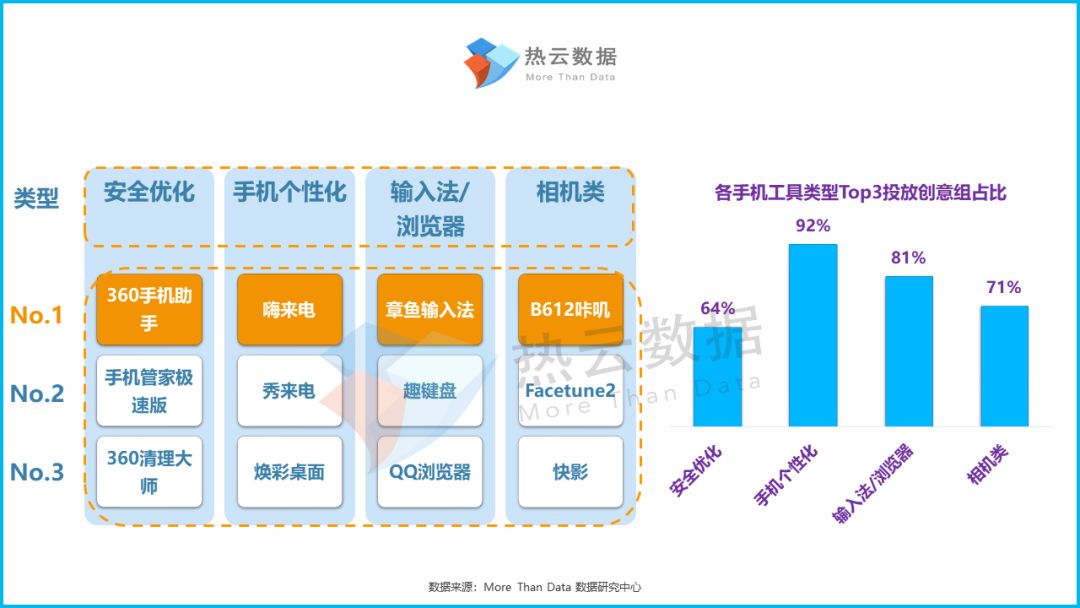 通过对手机工具App各主要类型投放创意组量Top3的App进行梳理与对比,360手机助手、嗨来电、章鱼输入法以及B612咔叽,分别是各类型Q3投放量最高的App。下右图中,通过对于各类型Top3所投放创意组数量与该类型total投放量之间的占比,可以看出:手机个性化类App的“买量头部化”特征相对明显;而安全优化以及相机类app的头部买量占比较低,买量竞争较为明显。