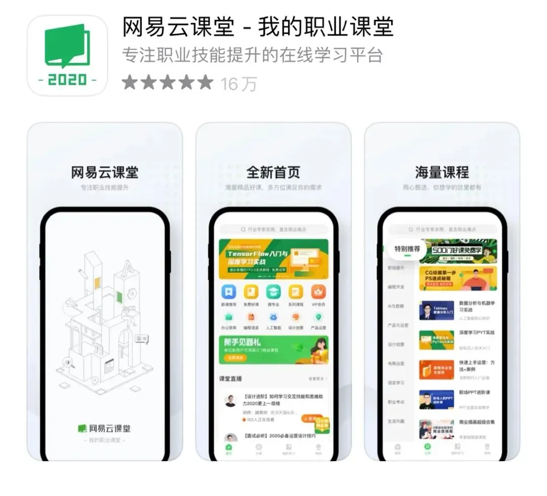 网易云课堂一款在线学习网站。它上面的课程覆盖了各行各业,不管你是在校大学生还是上班族,在这里都能让你更好的充实自己,提高自己。它还有一些不错的小功能,比如还有题库,笔记,问答等功能来提高学习的质量。
