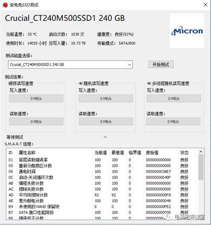 CDI这个软件看起来更像是SSD Z,与前边的CrystalDiskMark是同一家的两个应用。DiskInfo的主界面会像SSD Z一样展示SSD的基本信息,但不同的是,它还可以看SSD的健康状态、温度,以及使用时间和次数,是很不错的验机软件。