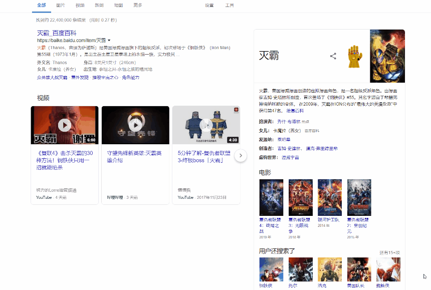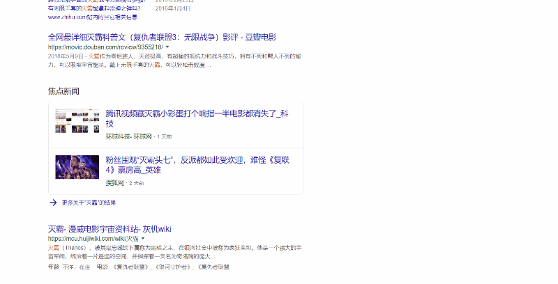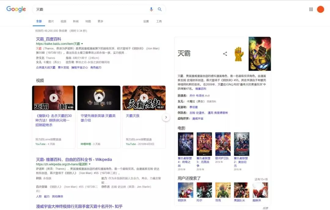 作为全球最大地浏览器软件,谷歌在复联4热播地同时,也不忘皮一下,在谷歌浏览器里埋下了一个专属反派人物@灭霸 的彩蛋。