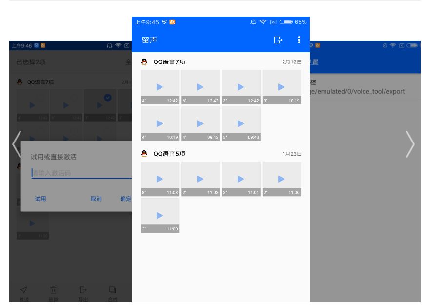 一款汇集合成,删除,分享,导出,备注功能强大的语音管理软件。快速的扫描出微信、QQ和TIM中的语音文件。操作非常简单。注意软件需要一定的收费。