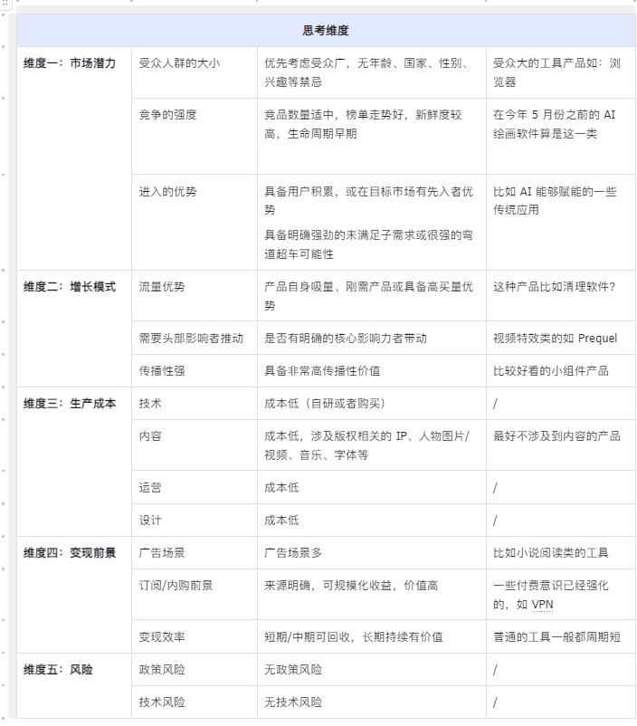 这个筛选过程的目的是找到具有高用户需求、高用户价值和良好商业潜力的产品方向,从而帮助开发者打开思路,跳出自己原有的思维框架。