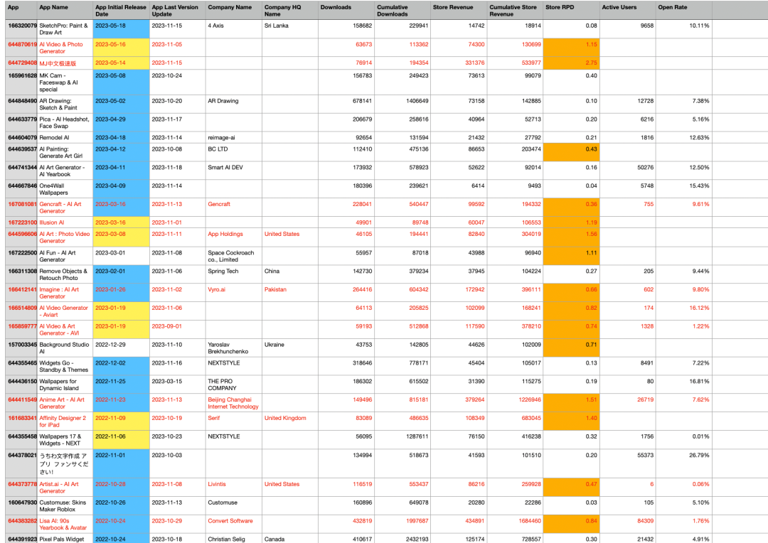 在这些标记的产品中,观察到一个显著的共同点:大多数是 AI 绘画类的 APP,只有少数是海报或 Logo 设计 APP。