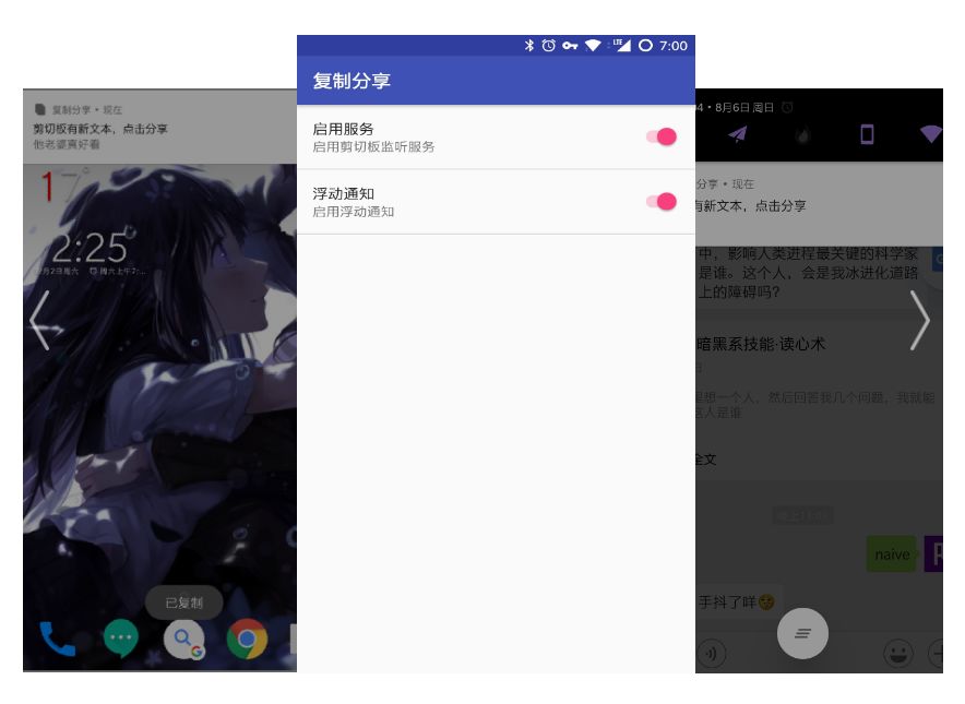 复制分享,监听你的剪切板,当你复制一段纯文本的时候会收到通知,在通知中可以呼出分享界面,将刚刚复制的文本分享到其他应用。