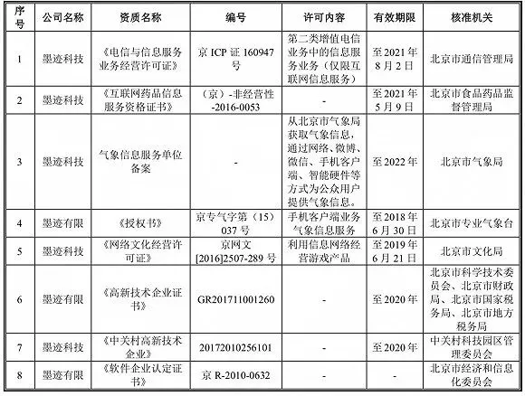 证监会文件要求,发行人存在在取得《互联网药品信息服务资格证书》之前,发布药品广告的情形;发行人现有的APP存在视频节目与游戏节目,以及发布医院广告;发行人经营视频节目是否需要办理《信息网络传播视听节目许可证》或履行备案程序;广告业务是否符合《广告法》及《互联网广告管理暂行办法》等法律法规及及行业监管政策的规定,是否受到过行政处罚等。这些资质的疑问都与墨迹天气纷繁复杂的广告业务相关。根据招股书,墨迹天气已经已获得的各类经营资质的具体情况如下: