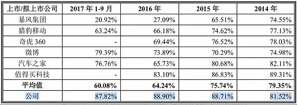 以上销售数字基本宣告公司硬件尝试的失败。相反,空气果却将公司拖入专利诉讼战。诉讼方则是公司的前任供应商。至公司2018年年初披露招股说明书时为止,公司存在尚未了结的诉讼案件4起,均为与智能硬件空气果相关。与之对比的是,墨迹天气的市场推广费用同比显著增加。互联网流量红利结束,各大互联网公司的获客成本都在增加,墨迹天气不能幸免。2014 年至 2017 年 1-9 月,墨迹天气的推广费用分别为 678.37万元、3079.46万元、6716.03万元和 5556.42 万元,同比增长幅度以倍数计算。“公司存在如果未来推广单价大幅上升,导致推广成本上升进而导致公司净利润下滑的风险。”墨迹天气高毛利率高。其平均80%以上的毛利率与同样的“免费+广告”模式公司相比,仍显得非常突出:
