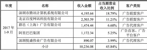 其中,阿里巴巴作为股比高达15%的股东,与墨迹天气有千丝万缕的联系。阿里巴巴是股东,又是供应商和大客户。其中收入方面主要为与天猫、阿里妈妈等交易方发生的广告收入,成本及费用方面主要为与阿里云、 支付宝等交易方发生的IT服务成本、推广成本等。2016 年下半年,墨迹天气为扩大线下推广渠道,搭载阿里 Yun OS 系统的手机中预装墨迹天气 APP,低于市场均价;2017 年 1-9 月浙江天猫在墨迹天气 APP 投放了“天猫年货节”、“天猫 618 理想生活狂欢节”、“天猫夏日热练节”为主题的品牌广告,导致广告投放金额较上一年度略有上升;高德分别于2014年、2015年和2016年投放了效果广告;菜鸟于2014年向公司购买了少量空气果。作为一家极度依赖广告的公司,墨迹天气的前5大最终客户包括腾讯、百度、阿里、蓝标等,其收入贡献率占比由2014-2016年的80%在2017年降至45%,报告期内逐年减少了与关联方阿里巴巴集团之间的关联交易。