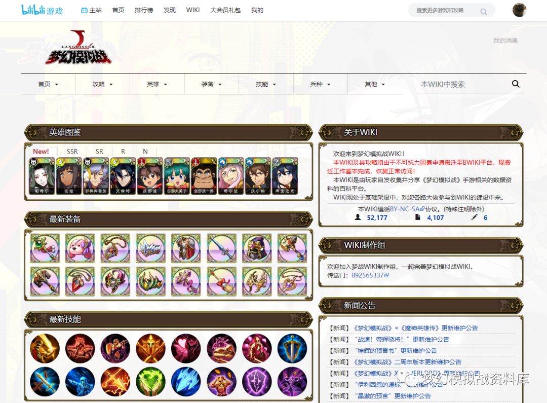 早前的wiki百科重新在B站复活,由一群热爱梦战的小伙伴在始终用爱发电,是很全面的梦战相关资料查询的站点:全英雄信息、装备图鉴、升级材料等等内容均可在此查询。