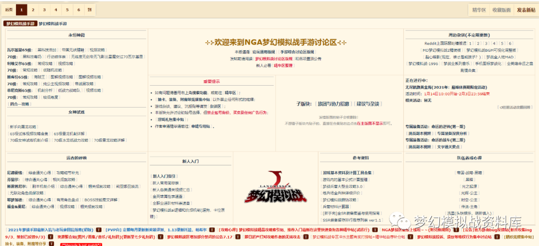 NGA梦战板块有很多厉害的大大,时常也会分享一些攻略、心得,有很多质量超高的帖子。版主科洛喵大大基本把很多特别实用的帖子都放在版头了,如果想要查看一些相关攻略,NGA的版头(还有精华区)是很不错的选择~