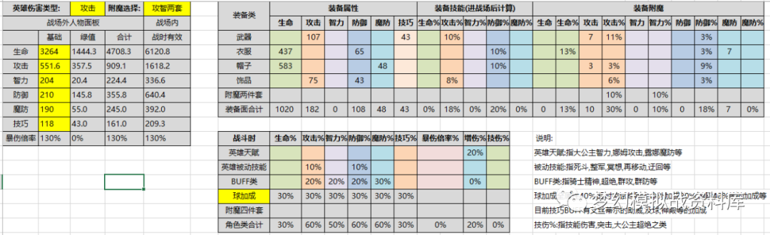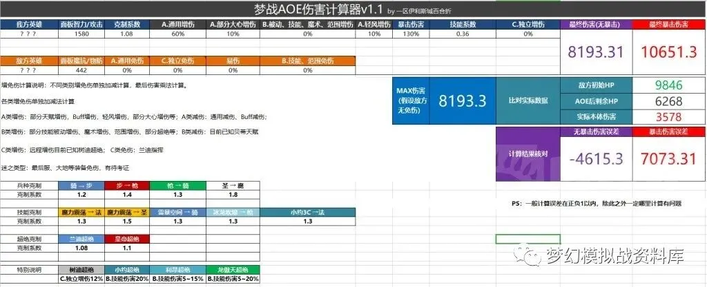 NGA上早前一位大佬自制的伤害模拟表,不过使用上需要对游戏内的一些伤害、减伤类别有所了解,适合对梦战有一定了解的小伙伴选择使用。另外,该表好久没有更新,精通石相关内容需要自己核对并稍微修改一下计算公式才可正常使用。