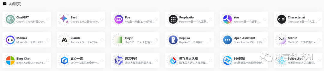 这些工具是国内外最知名、最火的一批,包括了ChatGPT、Bard、Claude、文心一言、通义千问、讯飞星火等等大模型。