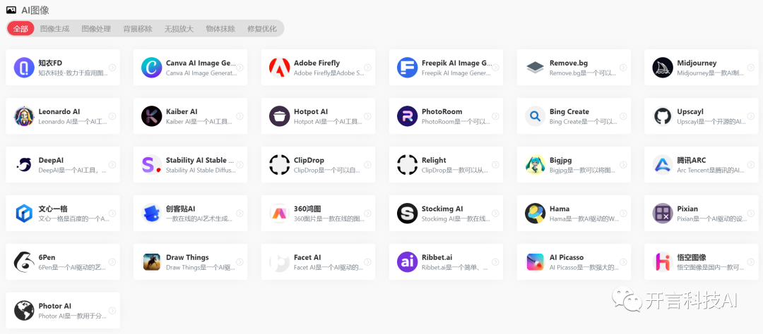 包括6个小类别:图像生成、图像处理、背景移除、无损放大、物体抹除、修复优化,可以根据自己的需求选择相应的工具。