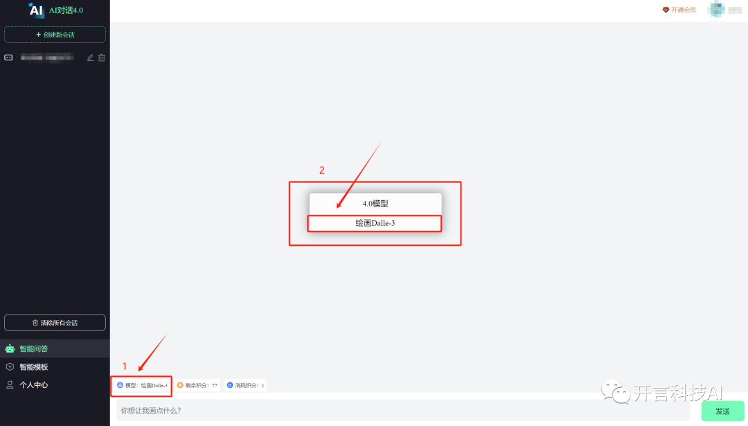 后台菜单栏点击“AI对话”,开启体验ChatGPT3.5,点击“开言4.0”就能体验强大的ChatGPT4.0!