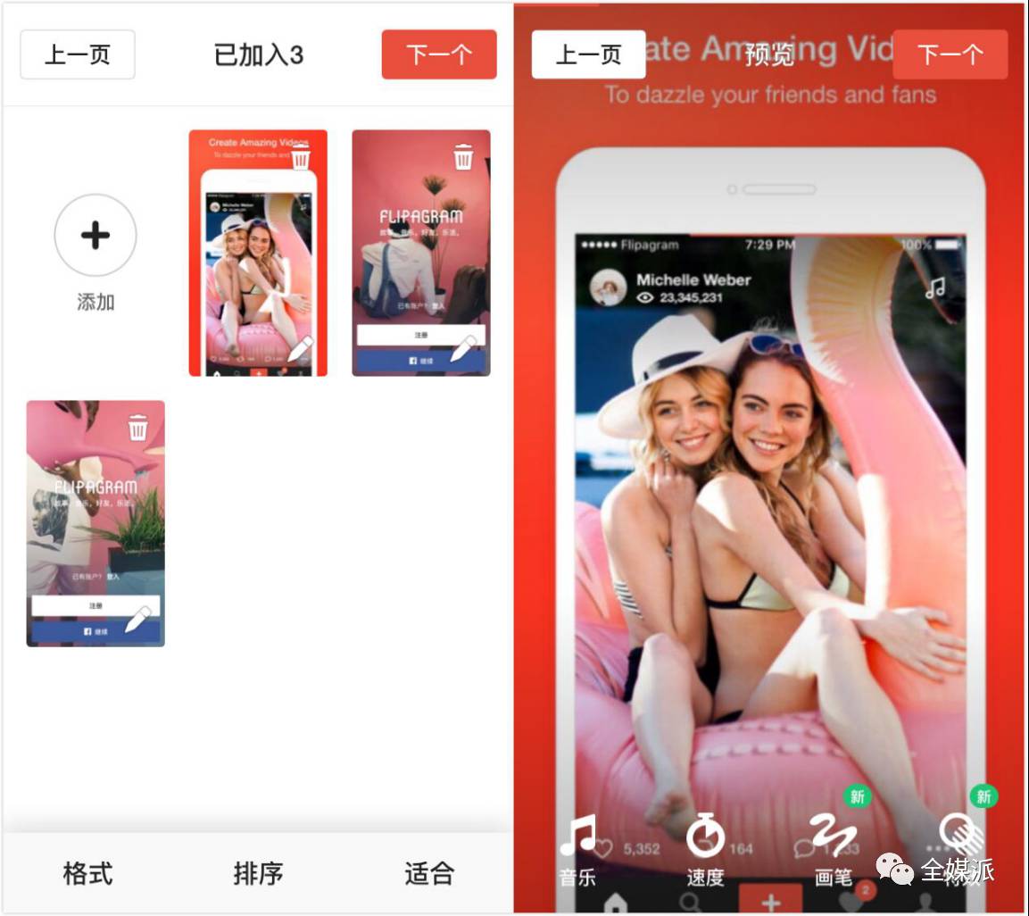 2.将照片进行排序,选择背景音乐并调整速度。如果没有喜欢的音乐,可以通过Flipagram的渠道来购买。除此以外,还可以添加自己的水印和设定标题。BTW,升级之后的Flipagram还有画笔功能和特效哦!