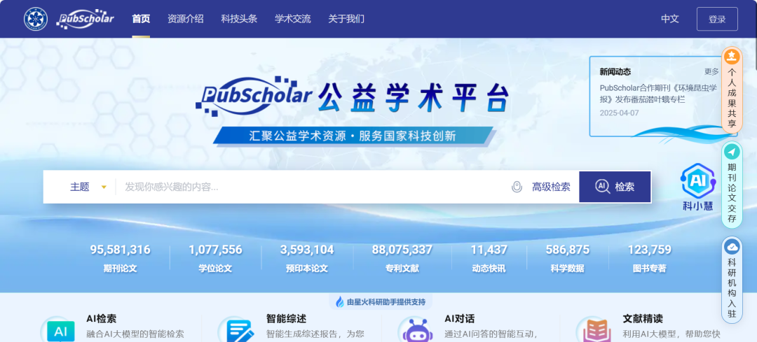 PubScholar公益学术平台由中国科学院文献情报中心、中国科学院计算机网络信息中心、中国科技出版传媒股份有限公司(科学出版社)为主建设。可检索的资源量约1.7亿篇,可免费获取的全文资源量约8000万篇,包含期刊论文、学位论文、预印本论文、专利文献、领域快报、动态快讯、科学数据和图书专著等类型。