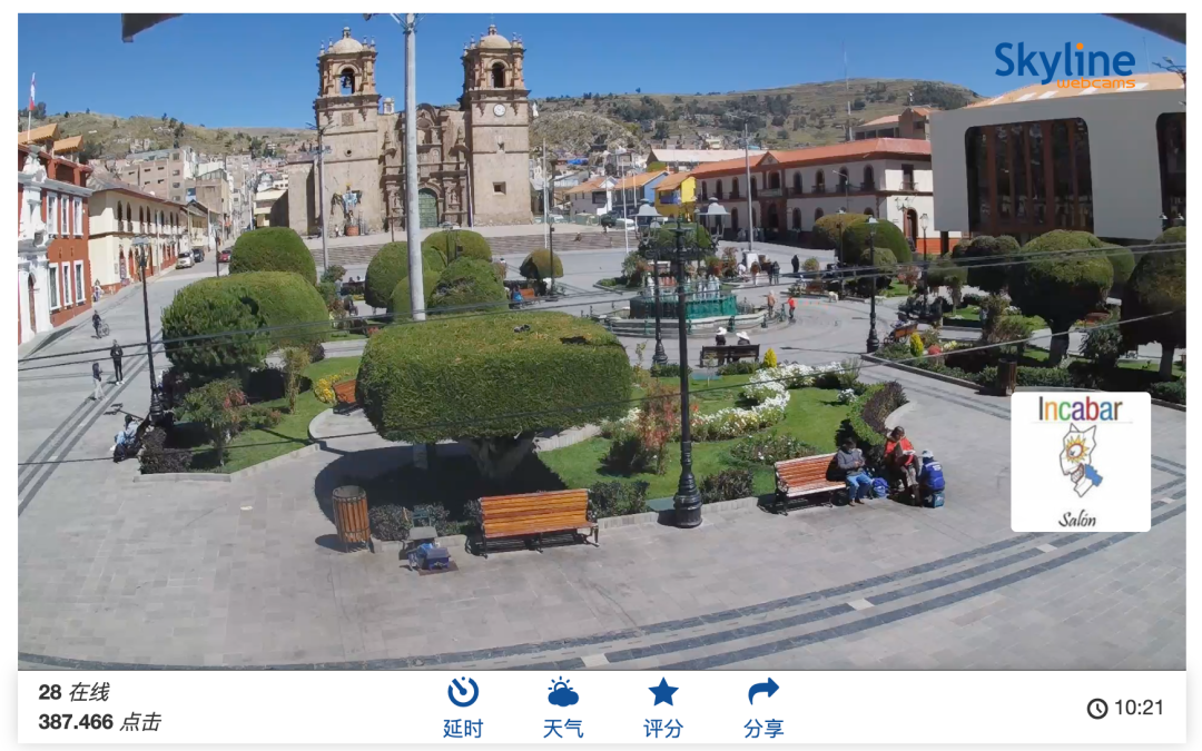 我们可以在「实况摄像头」菜单里筛选这59个国家,这里我选择了「秘鲁 普诺 - 市长广场」的实况摄像头。