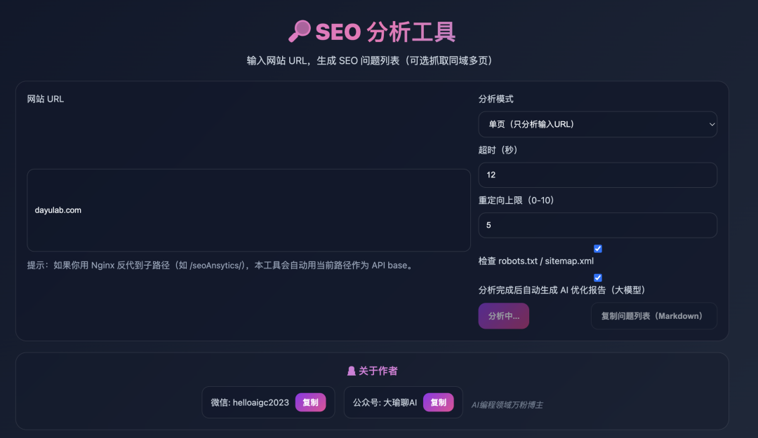 体验地址:https://dayulab.com/tools/analysis/seoansytics